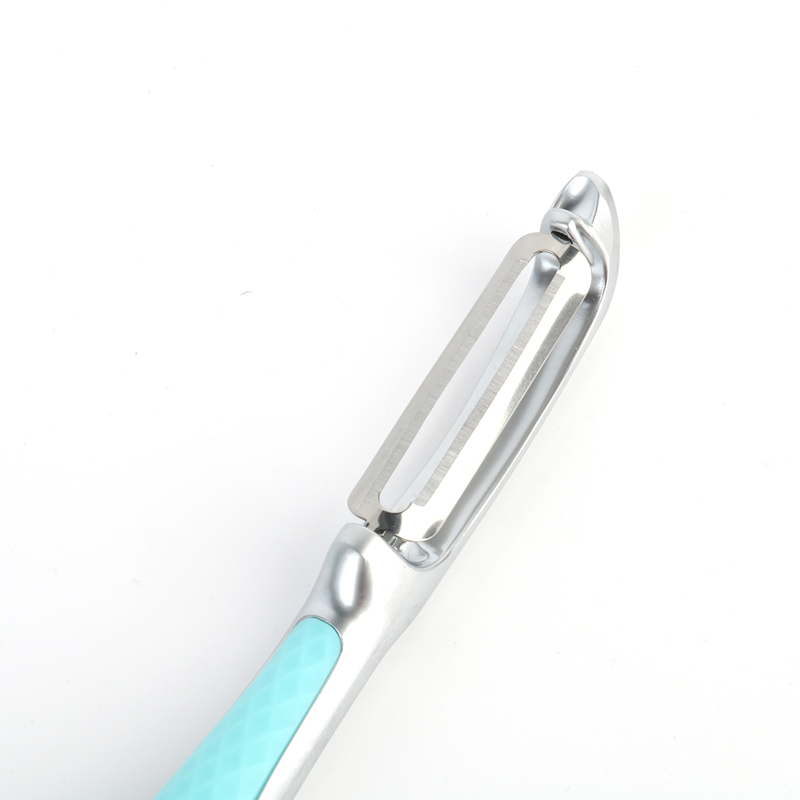 ເຄື່ອງປອກເປືອກຜັກໂລຫະປະສົມສັງກະສີຂະໜາດນ້ອຍທີ່ມີສີຟ້າອ່ອນມີຄວາມຍາວ 17 ຊມ ແລະ ນ້ຳໜັກ 82 ກຣາມ, ເຮັດໃຫ້ມັນເປັນເຄື່ອງມືໃນເຮືອນຄົວທີ່ຄຸ້ມຄ່າ, ປອດໄພ ແລະ ເຊື່ອຖືໄດ້. ການອອກແບບທີ່ເປັນເອກະລັກ ແລະ ທັນສະໃໝ ເຮັດໃຫ້ມັນເປັນອຸປະກອນເຮືອນຄົວທີ່ມີຄຸນນະພາບສູງ.